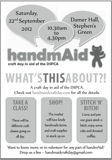 After a very successful first year, Handmaidcraft Day returns to Dublin on 22nd September. Why am I telling you a month in advance? Well, booking is now open for classes in Damer Hall on St Stephen's Green. And they will book up fast if last year is anything to go by. Entry will cost a fiver on the day and they will have all kinds of crafty goodness on sale. Proceeds will go to the Dublin Society for the Prevention of Cruelty to Animals.